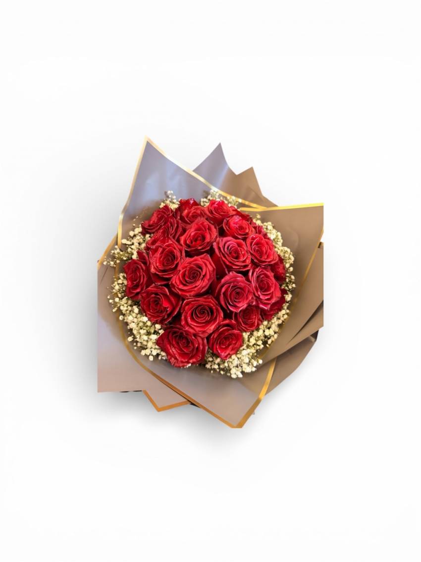 25 adet kırmızı ithal gül Kaliteli yeşillikler Özel süsleme malzemeleri